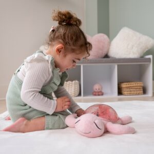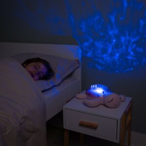 The Tranquil Turtle Aqua is a calming night light that projects ocean waves onto the ceiling and plays soothing sounds. Its soft glow and plush material make it a comforting companion for babies and young children at bedtime.