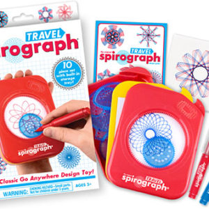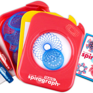 Now you can create countless amazing designs on the go with the classic Travel Spirograph! This portable Spirograph studio has a built-in design ring, work surface and storage compartment for holding your wheels, pens, paper, design guide and finished artwork. The Travel Spirograph is the perfect “go anywhere design toy”!