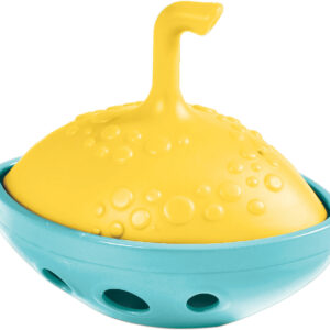 Floats as a boat, sinks as a sub! This interactive, transforming tub toy encourages cause-and-effect thinking, reasoning, and teaches basic physics. When the soft teal periscoped top is pushed into the stiff orange base, the toy floats – when fully extended and submerged in water, it sinks!
