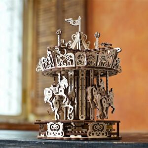 Round and round and back to where it’s all begun. Take a trip to your childhood memories with Ugears beautiful nostalgic model, the Carousel, the classic merry-go-round implemented in top-quality sustainable wood. Here you will find two types of carousel horses that rock up and down as the model spins. The core of the model is a center pole that rotates in a direction opposite to the main platform making it look as if the carousel spins faster than it really does and creates the fascinating dynamics of the whole construction.