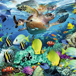 Swim with the sea turtles, clownfish, queen angelfish, Moorish idol fish, blue striped grunt and more in our vibrant “Underwater Paradise” puzzle!