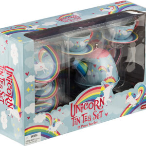 Come have a tea party with your favorite fantasy character, a beautiful, multi-colored Unicorn. The Unicorn Tin Tea Set from Schylling Toy, the world’s leader in traditional toys and classic fun, brings the magic of Unicorn’s to life. Complete with rainbows, clouds, hearts and stars. The 15 piece tea set includes a tray, 4 cups and saucers, 4 plates and a tea pot with removable lid. Unplug with some role playing fun with this classic toy.