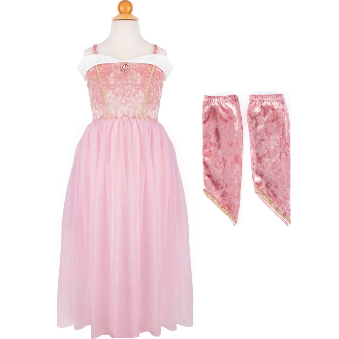 Bring your little one’s fairy tale dreams to life with the Velvety Soft Sleeping Sweetheart Princess Gown with Arm Warmers, inspired by the elegance of Sleeping Beauty. This enchanting gown features a soft, crushed pink velvet top with delicate spaghetti straps and a beautiful white trim along the chest, just like the iconic dress. The stunning pink gem at the center of the chest adds a touch of royal sparkle.