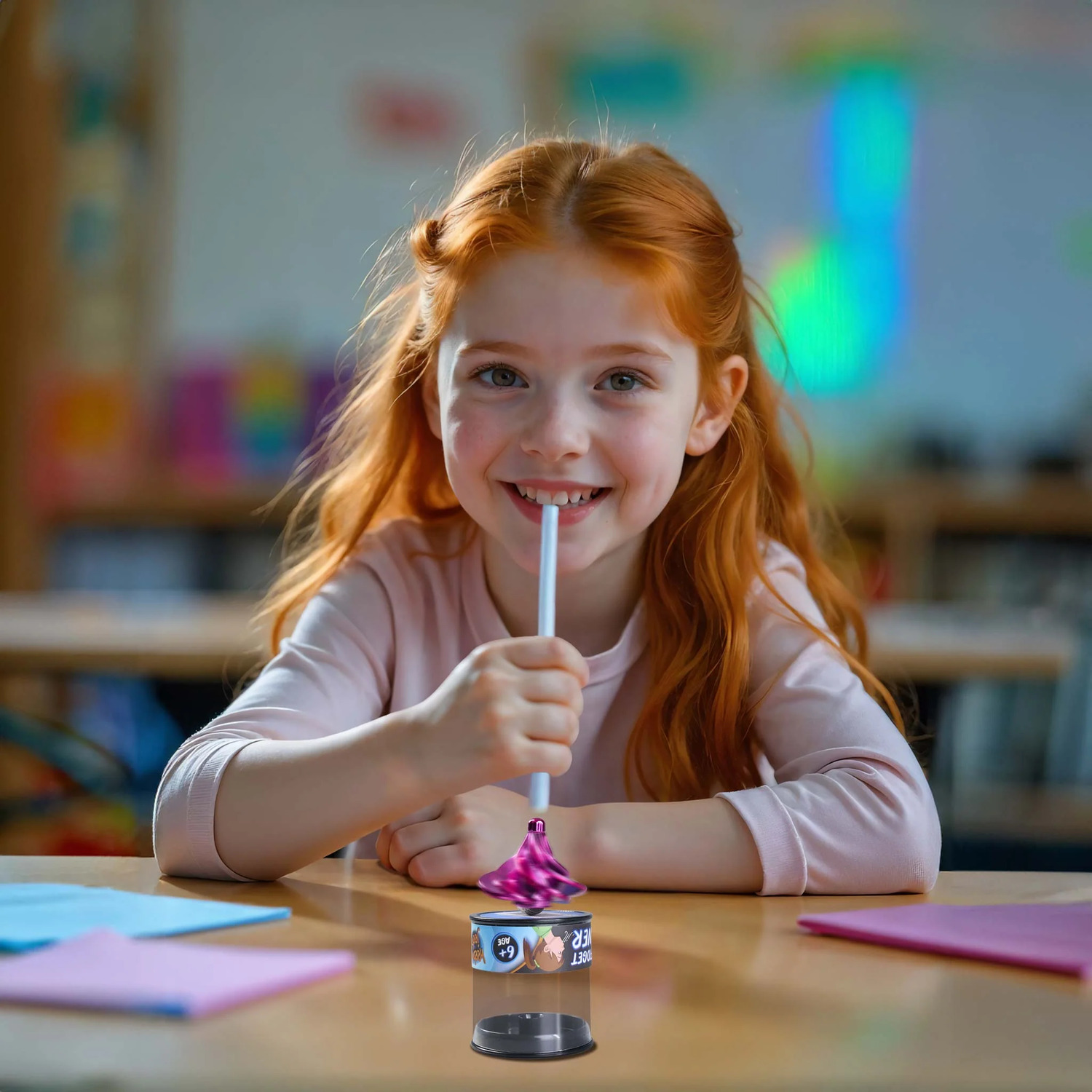 This top can be spun manually, but instead of relying on your fingers you can instead employ the principles of science. Direct a steady stream of air downward onto the top, and it will spring into motion! Enhance the airflow with a straw for a more focused effect, and it will continue spinning as long as you keep blowing.