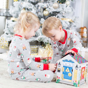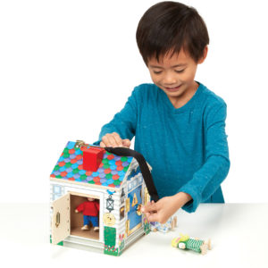 Ding Dong! Fun is at the door of this soundly-built wooden doorbell house. Four electronic doorbell sounds, four unique locks with matching keys, and four pose-able play people are included with this charming cottage! The keys are attached to the house so they won’t get lost, and the sturdy handle allows this exciting house party to go wherever children go!