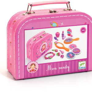 A beautiful wood vanity with accessories to complete the experience for any young beauty, all contained in a convenient carrying case. Each piece is wooden. Includes: Bracelet, 2 rings, 2 hair clips, lipstick, nail polish, handheld mirror, hairbrush Helps develop imagination, creativity, and role playing. From Djeco for ages 4+
