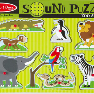 Listen to the voices of eight favorite zoo animals when the puzzle pieces are correctly placed in the puzzle board! Each animal piece has a matching full-color picture beneath. Eye- and ear-catching puzzle enhances matching and listening skills.